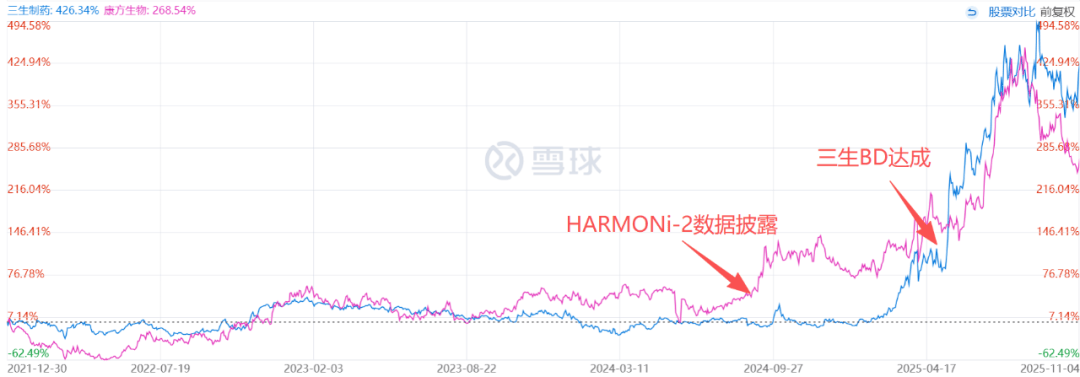 在这场浪潮中,三生制药的动作最引人瞩目。2025年5月20日,三生制药宣布与辉瑞达成总金额60.5亿美元的重磅合作,将PD-1/VEGF双抗SSGJ-707的海外权益授予这家全球制药巨头。其中,12.5亿美元首付款刷新了中国创新药出海首付款的最高纪录,也让三生系股价三天暴涨超70%。而就在同一日,康方生物股价一度跌超5%,市场敏锐察觉到,三生制药的横空出世,正在悄然改变PD-1/VEGF赛道的竞争逻辑。